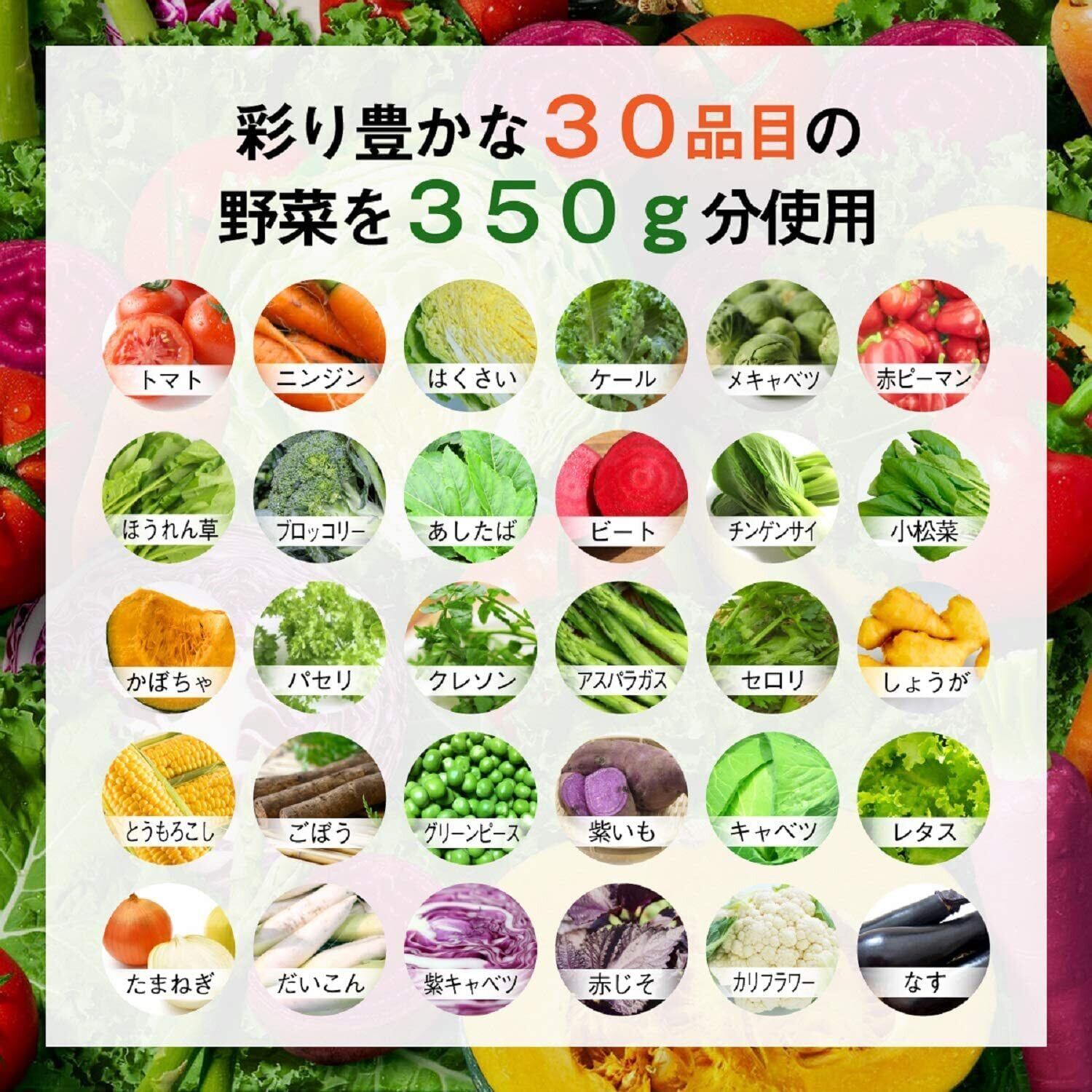 野菜(トマト、にんじん、メキャベツ(プチヴェール)、ケール、ピーマン、ビート、ほうれん草、ブロッコリー、あしたば、チンゲンサイ、小松菜、かぼちゃ、パセリ、クレソン、アスパラガス、セロリ、しょうが、とうもろこし、ごぼう、グリーンピース、紫いも、キャベツ、レタス、たまねぎ、だいこん、紫キャベツ、赤じそ、カリフラワー、なす、はくさい)、レモン果汁