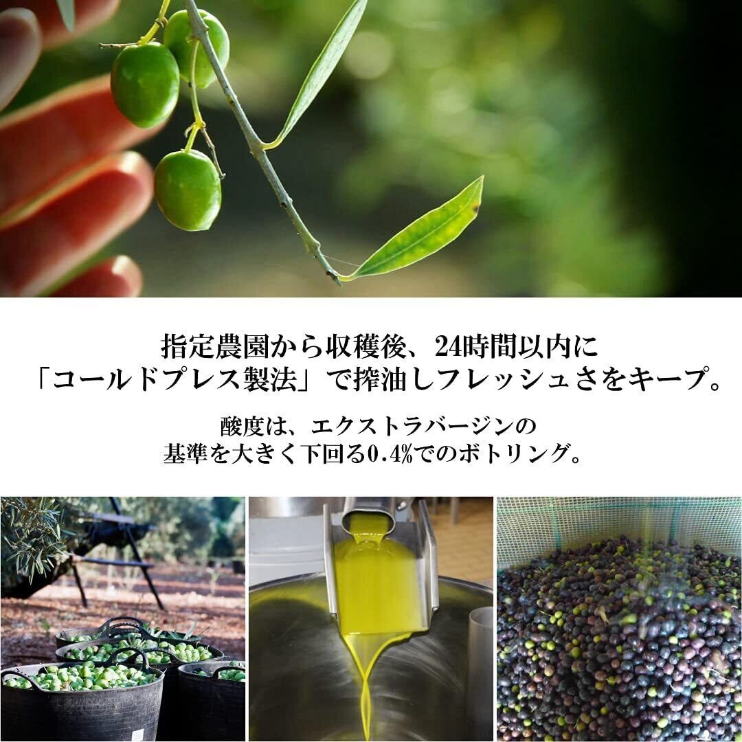 アンダルシア州の有機オリーブのみを使用。品種はピクアルとオヒブランカを中心に、収穫時に最良の果実を選びブレンドしています。収穫したオリーブの実は24時間以内に素早く「コールドプレス製法」で搾油され、香り、酸度、品質の厳しいチェックの後、出荷されます。酸度はもちろん0.8以下です。