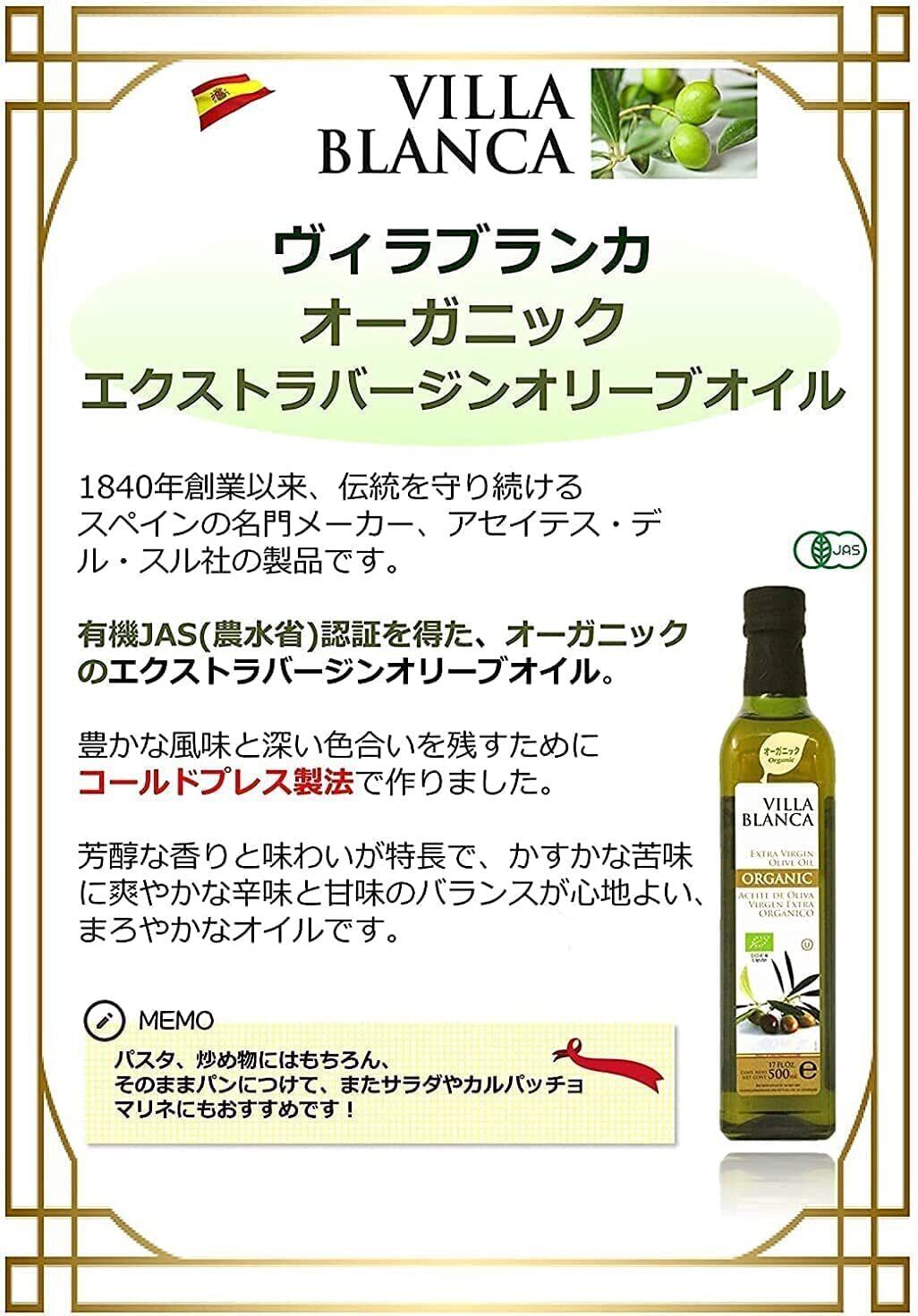 ヴィラブランカ オーガニック エクストラバージンオリーブオイル 500ml 瓶 【コールドプレス製法 有機JAS認証】