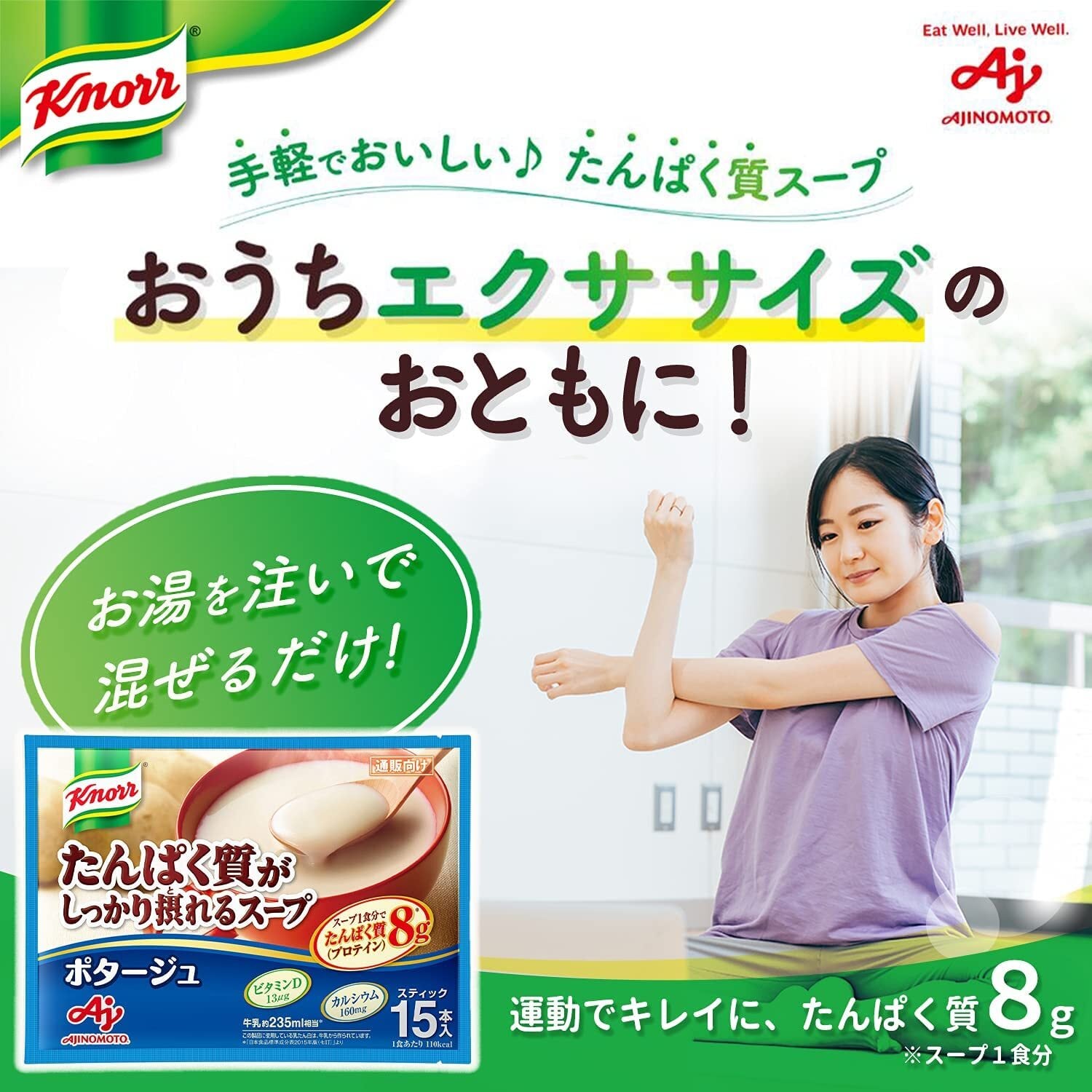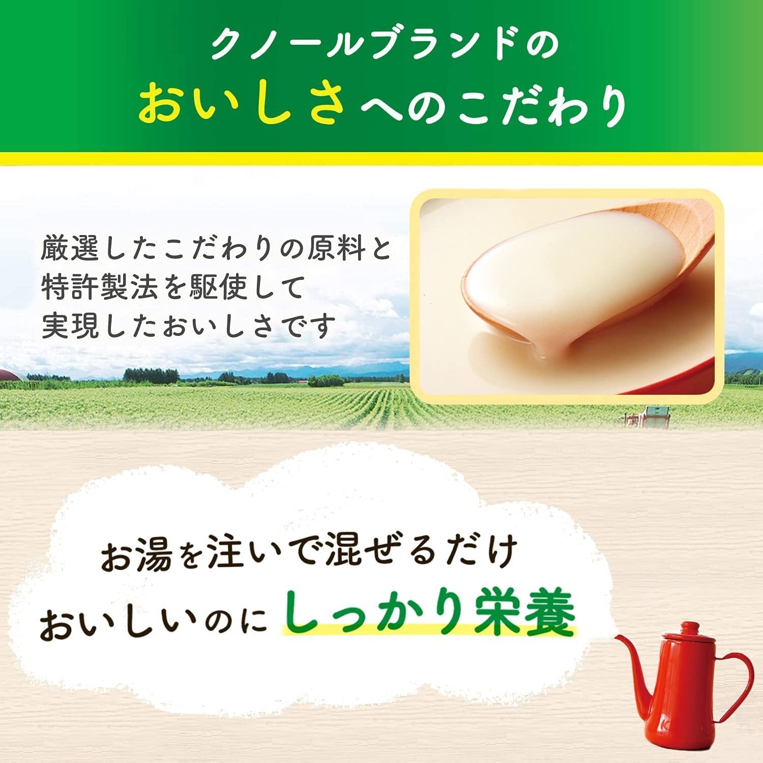 「クノール」の厳選した原料や卓越した開発・製造技術と味の素社の栄養知見を活かした、おいしくて栄養がしっかり摂れるスープです。高齢者にとって特に重要なたんぱく質や不足しがちなビタミンDやカルシウムを含み、たんぱく質の摂取が不足しがちな朝食や昼食に手軽においしく食べられるので、高齢者の日々の健康づくりに役立ちます。たんぱく質は筋肉や血液などのもとになり、カルシウムは骨や歯などのもとになる大切な栄養素です。